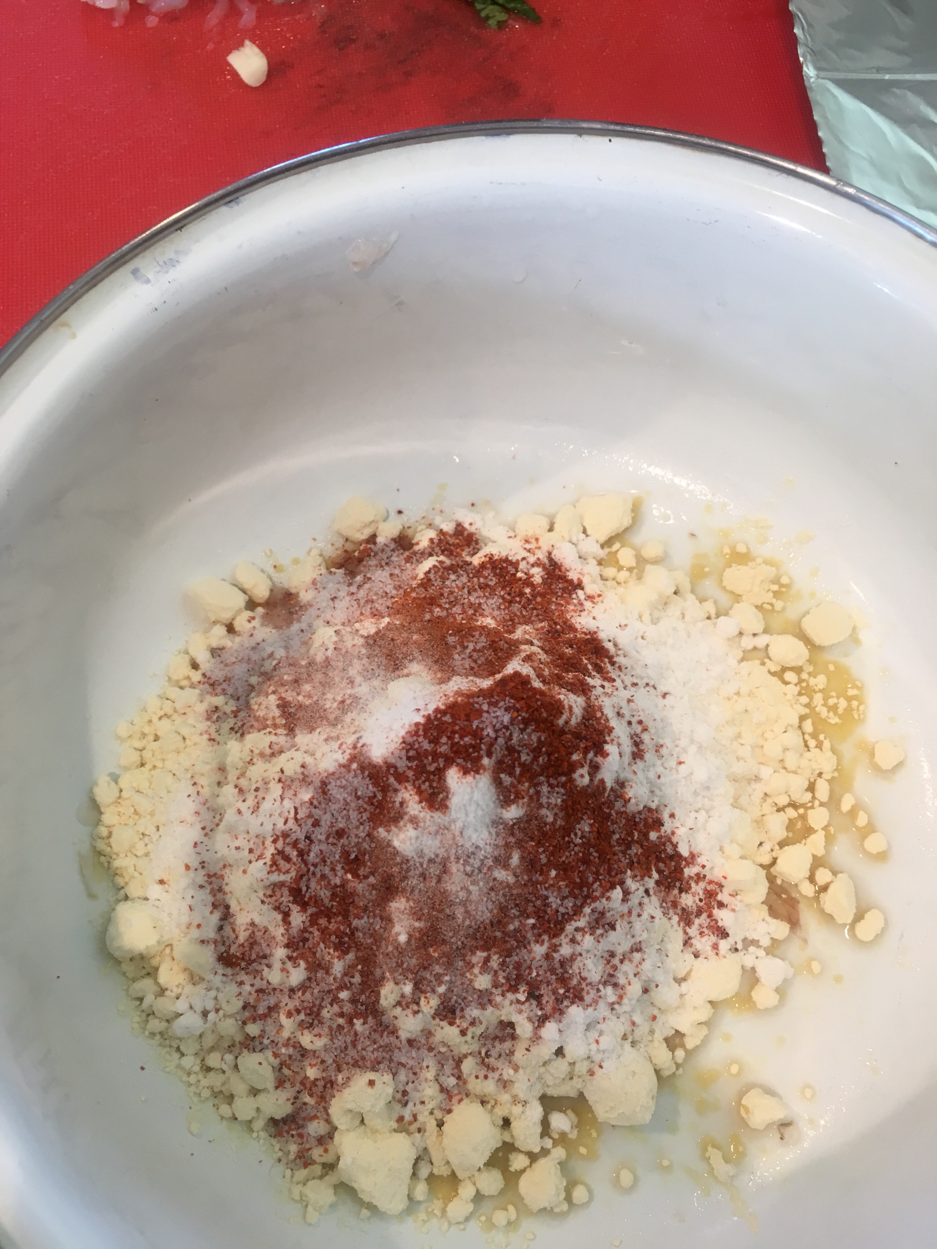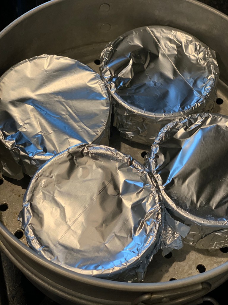 Step 6 :- pour the mixture into four steam-able containers . Cover with aluminum-wrap.