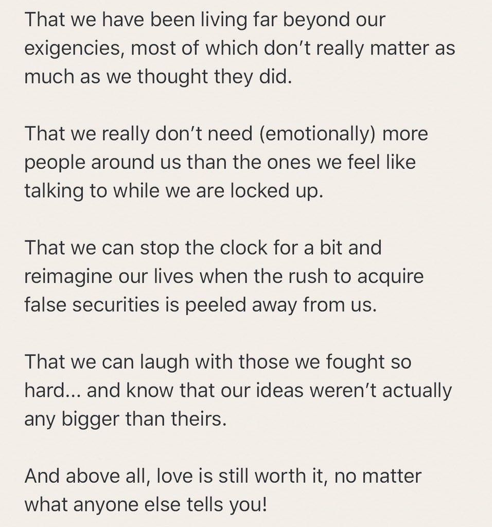 We have been taking our Mother Nature for granted . Deforestation, killing animals ruining the ecosystem , chemical hazards , pollutions and what not … and see how Mother Nature is punishing us and she is able to breathe. You can see clear blue sky , pollution free Mother Nature . But then again looking at the suffering of the entire world makes me wonder when this will end . Can we all learn and remember that if we can ever come back to our normal life we can be more human , provide more love and compassion to everyone including animals , trees and realize that Mother Nature is for everyone not act selfish , not behave as monsters .