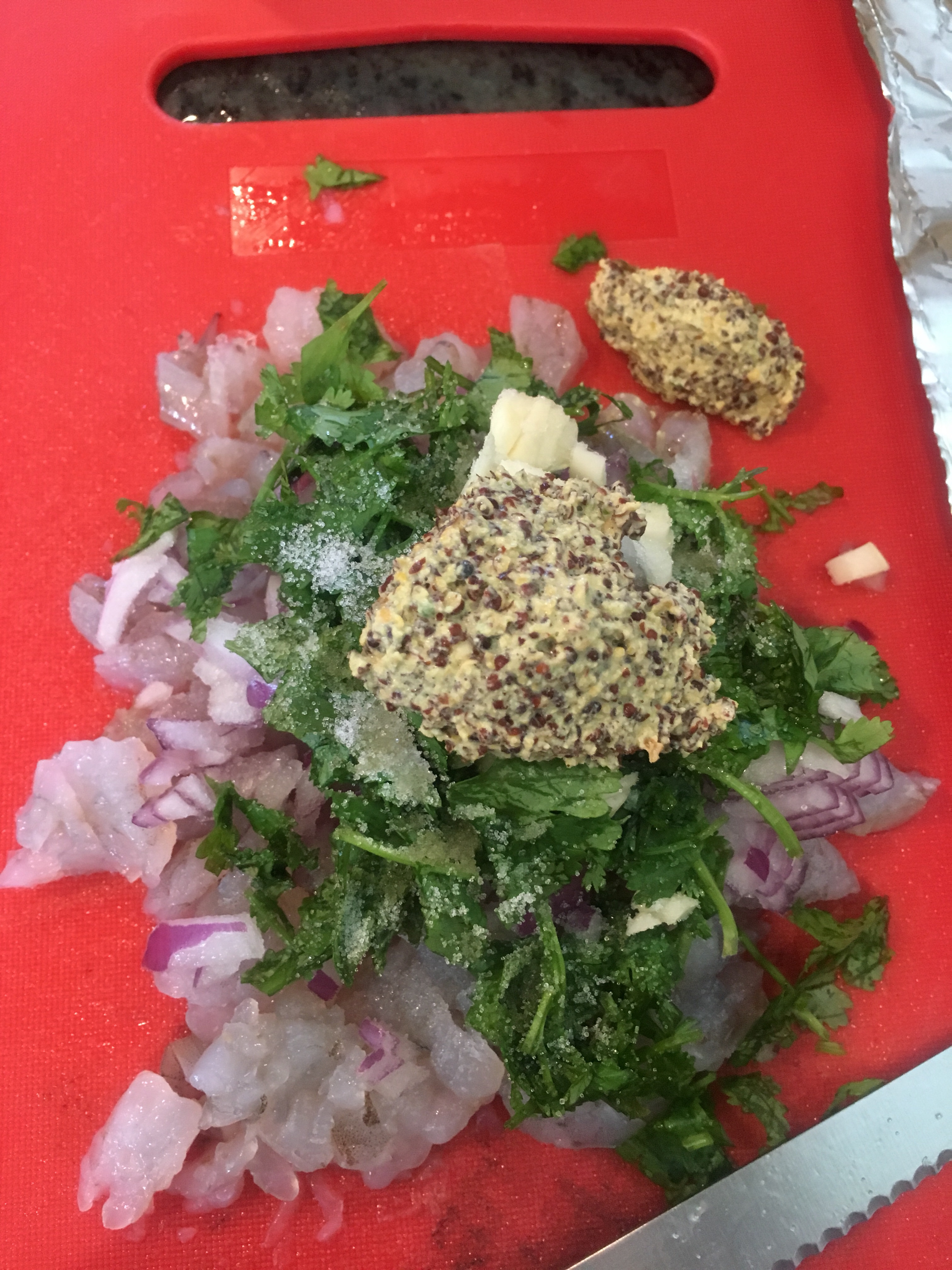 - In a bowl , mix shrimp , with chopped onions, garlic, green chillies, coriander leaves, mustard paste, salt to taste , pinch of sugar .